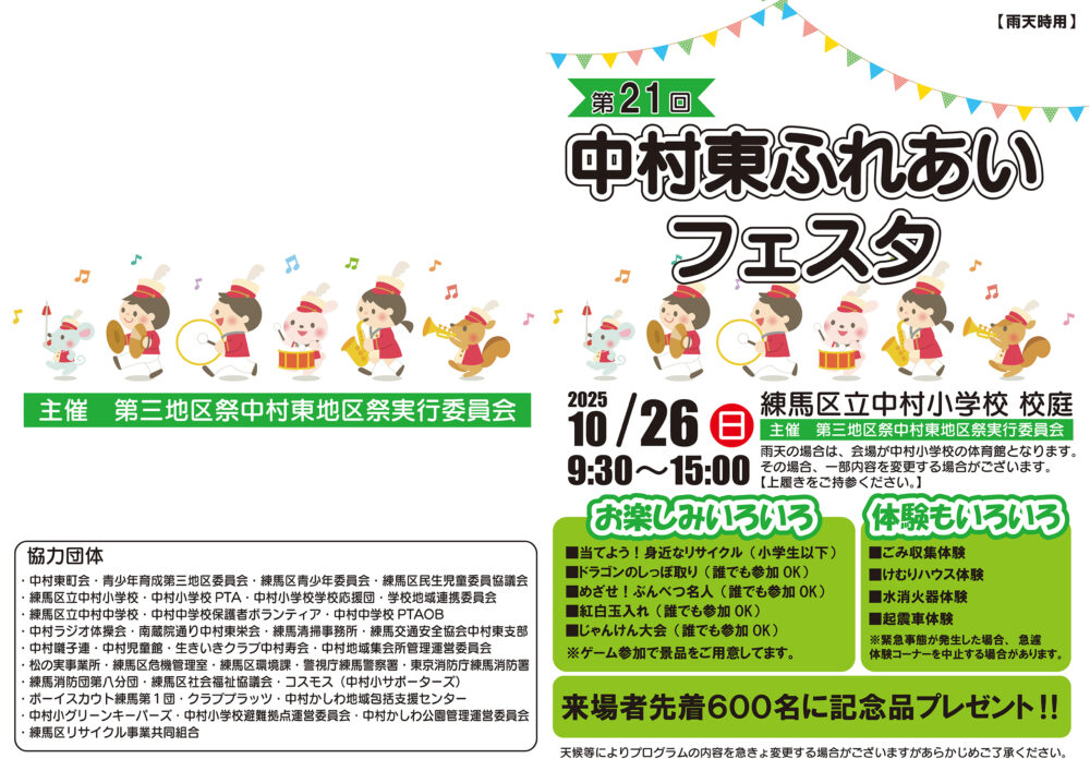 2025年10月27日(日)「第21回中村東ふれあいフェスタ」が練馬区立中村小学校で開催されます!