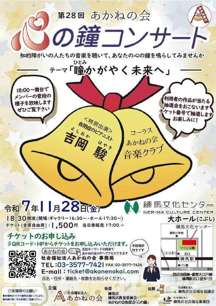 あかねの会では、第28回心の鐘コンサートを11月28日(金)に練馬文化センター大ホールにて開催いたします。