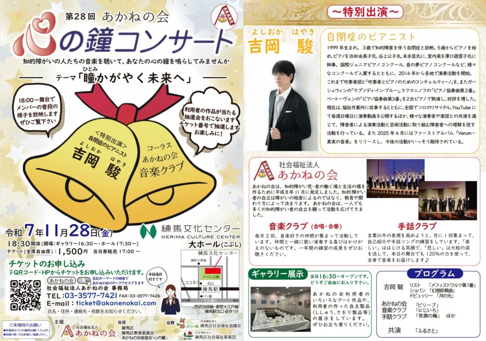 コンサートでは、あかねの会の音楽クラブが『瞳かがやく未来へ』をテーマに選曲し、混声二部合唱を披露します。また、特別ゲストには、自閉症のピアニスト 吉岡 駿さんをお招きしています。皆様どうぞ足をお運びください!