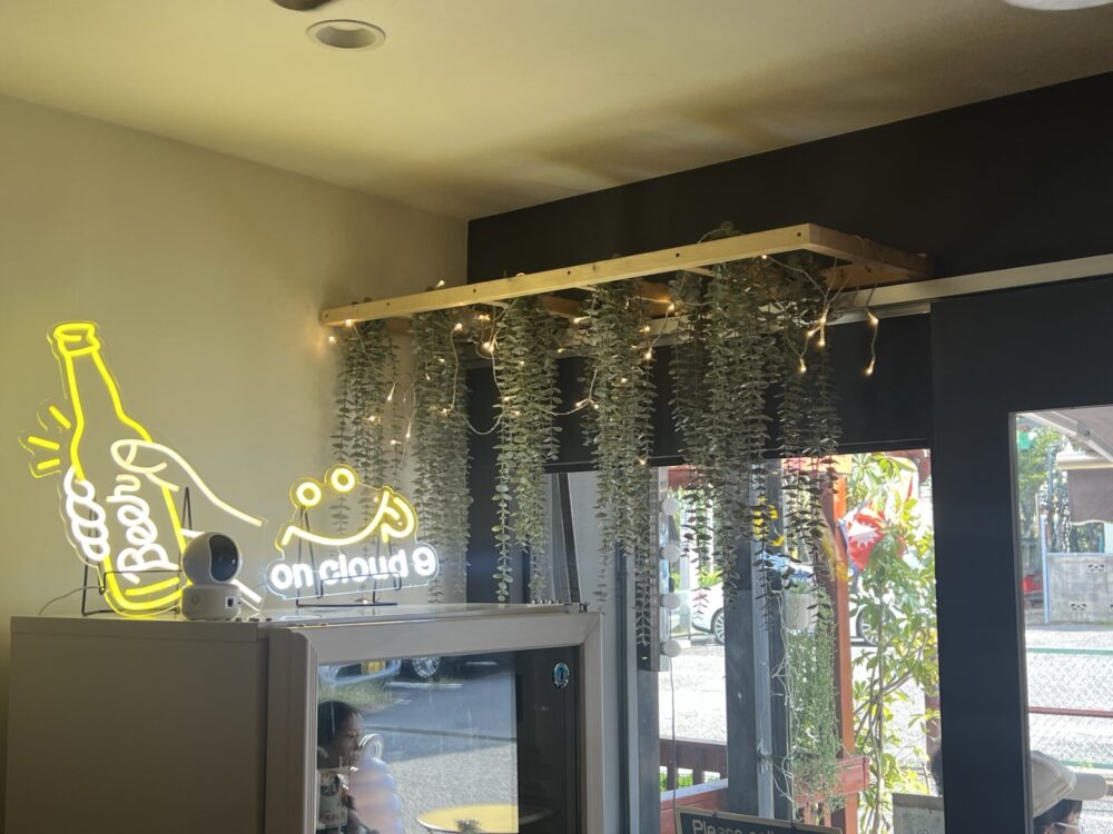 天井から吊るされたグリーンや、蛍光ネオンの「on cloud 9」サインなどが印象的で、韓国カフェのようなおしゃれさがあります。