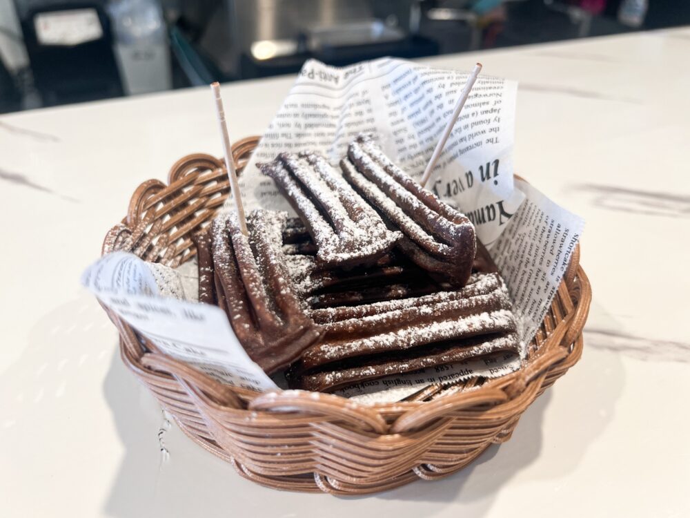 チョコチュロスはカリッとした食感の中に濃厚なカカオの風味が広がり、仕上げの粉糖が絶妙な甘さをプラスしています。