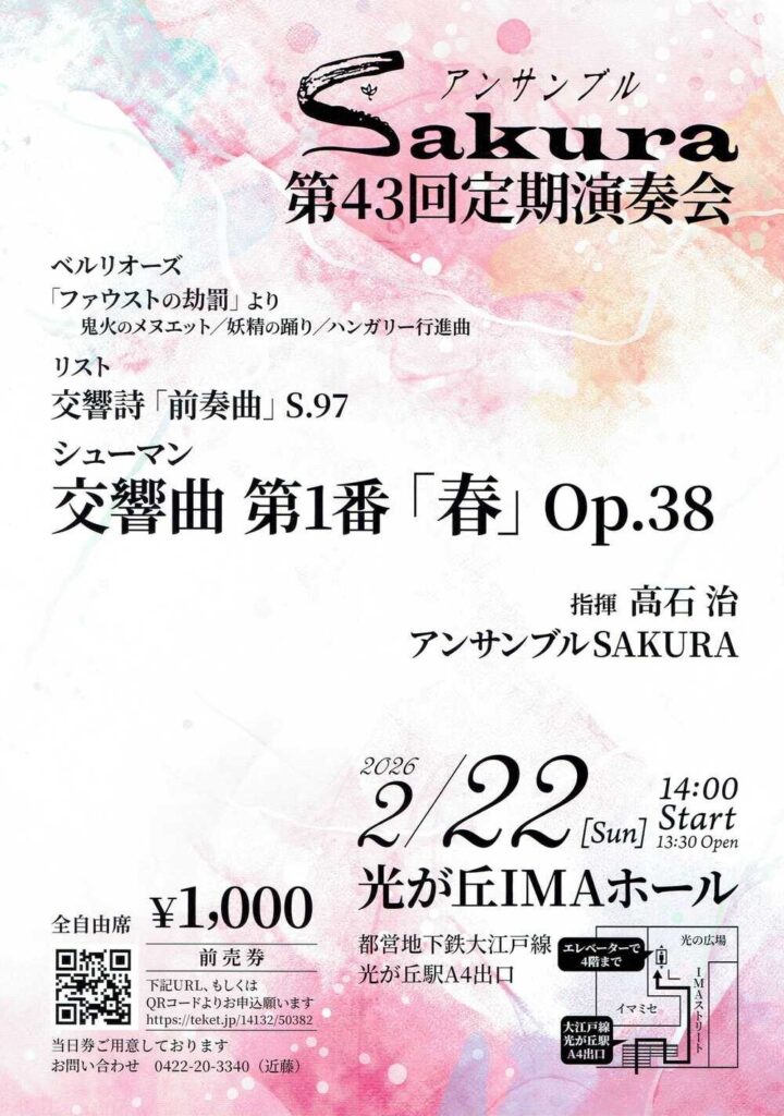2026年2月22日(日)「アンサンブルSAKURA 第43回定期演奏会」が光が丘IMAホールで開催されます!