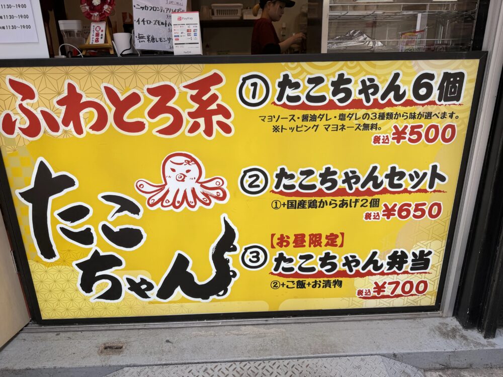 全体的には黄色で目立つ看板と「たこ」のロゴ書かれた白い提灯と、可愛らしいタコのキャラクターが目印。