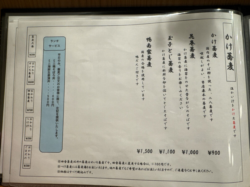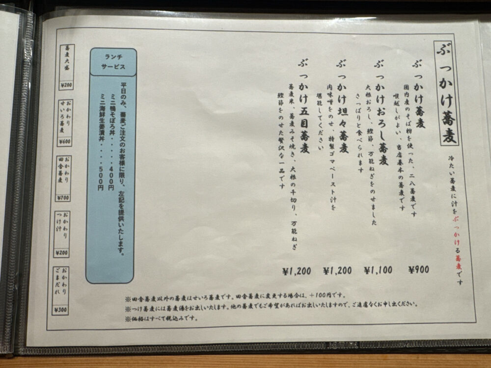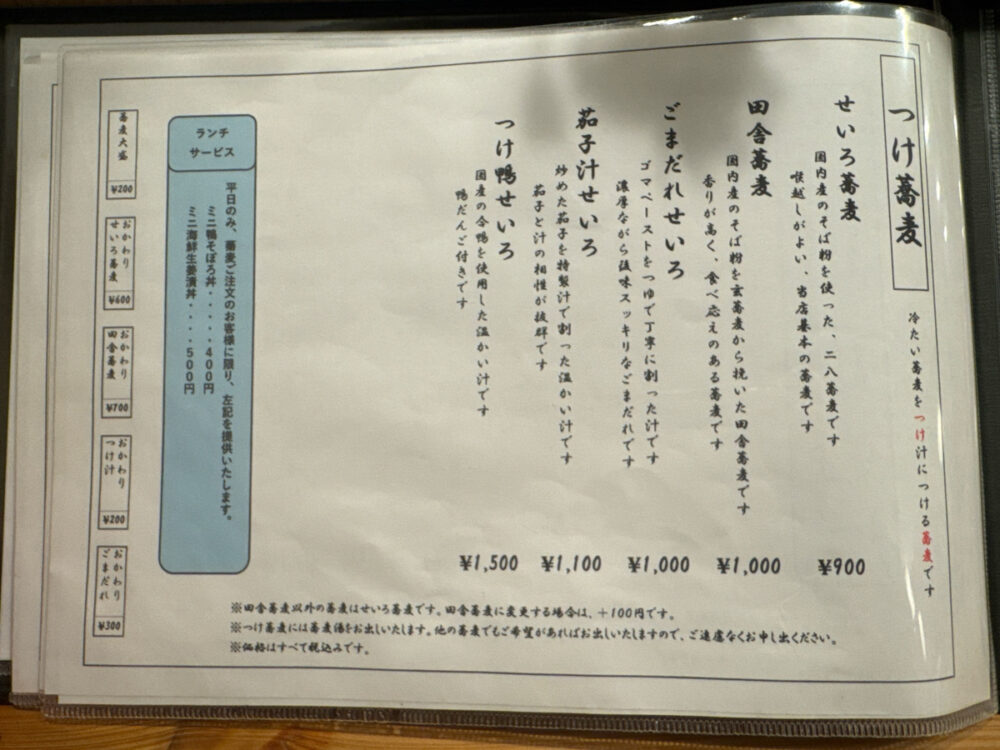 そば粉は国内産を使用。基本は二八そばで、「せいろ」「田舎蕎麦」「ごまだれ」「若子汁せいろ」などのつけ蕎麦メニューが並びます。