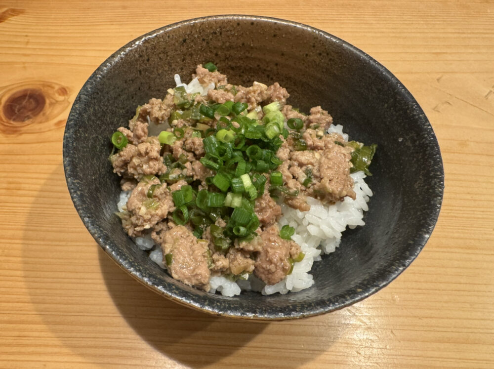 鴨そぼろ丼はしっとりとした鴨肉に甘辛いタレが絡み、薬味のネギと卵黄がアクセント。