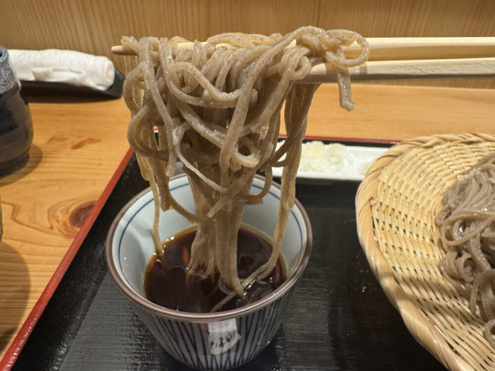 太めで香り豊かな田舎蕎麦は、噛むほどにそばの風味が広がり、出汁のきいたつけ汁との相性が抜群。