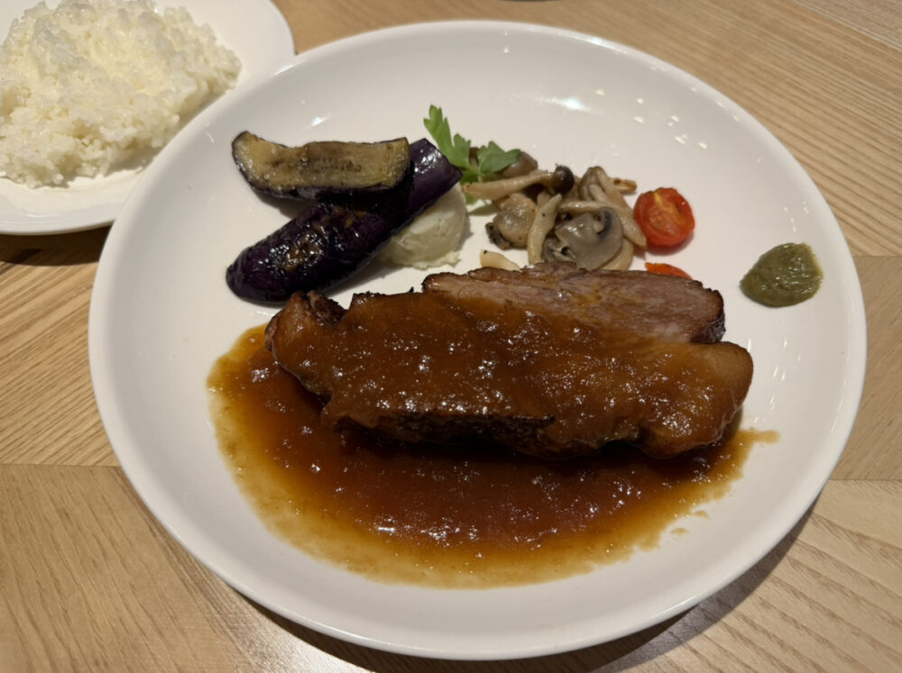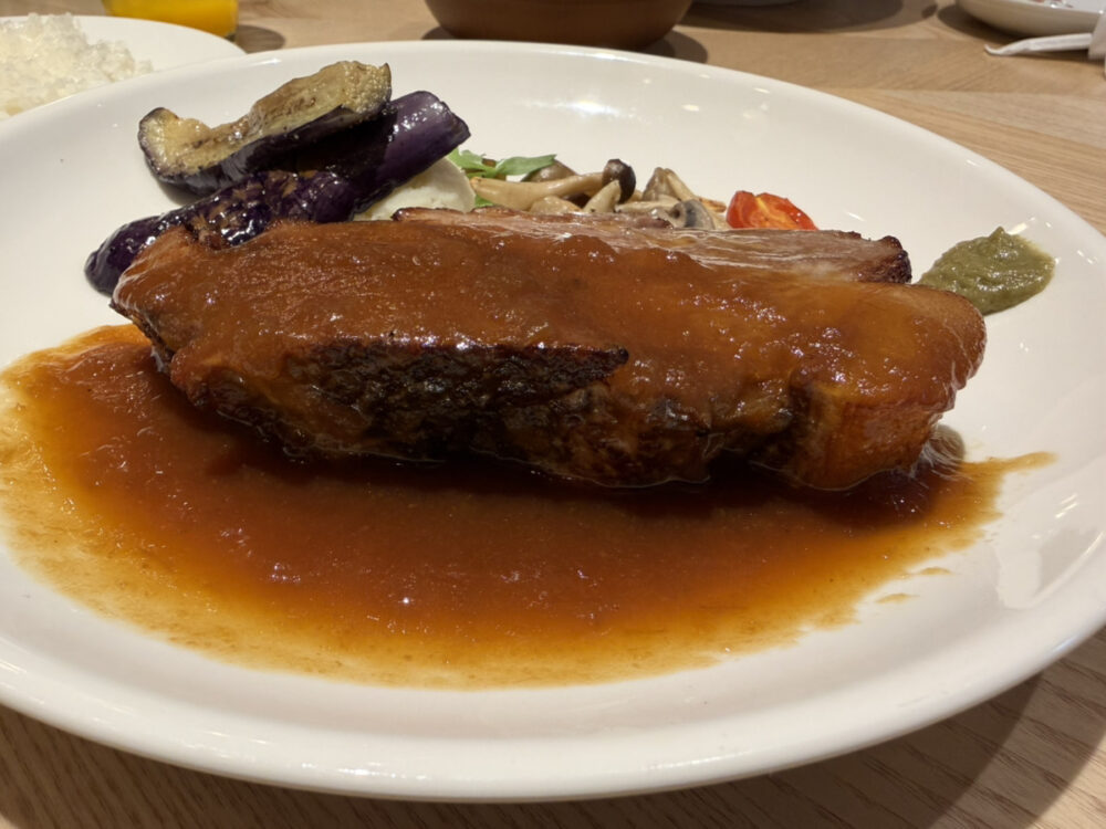 付け合わせのナスとキノコも丁寧に調理されていて満足度が高いです。