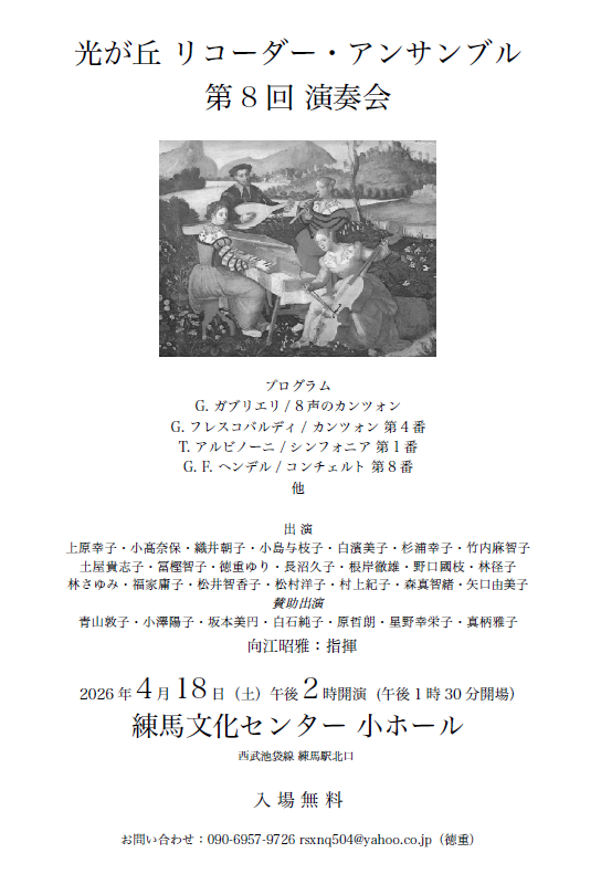 2026年4月18日(土)「光が丘リコーダー・アンサンブル第8回演奏会」が練馬文化センターで開催されます!