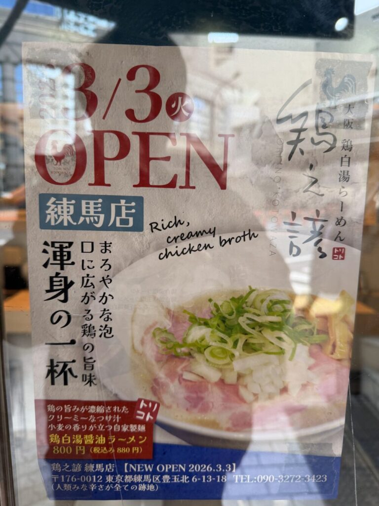 2026年3月3日練馬駅からすぐの場所に、大阪で話題のラーメン店が「鶏之諺(とりのことわざ) TOKYO01」としてオープンしました!