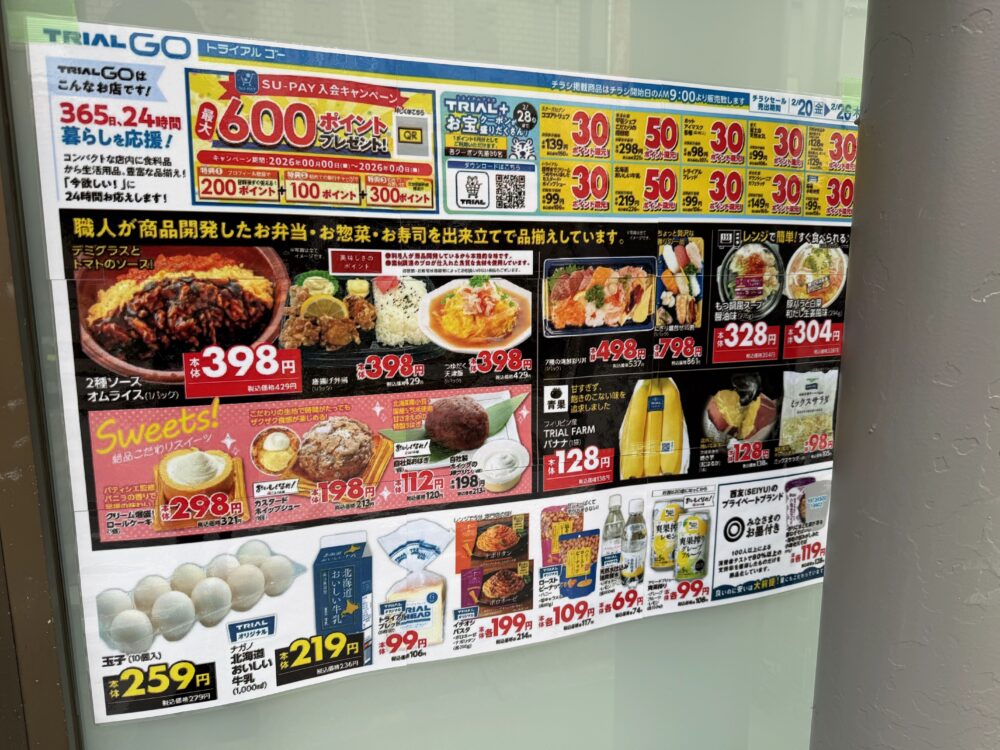 以前の建物をリニューアルし、トライアルらしい白と青の爽やかな看板が掲げられています。入口横には大型のサイネージが設置されています。