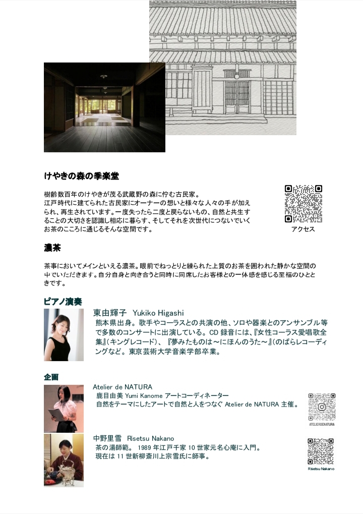 豊島園近くのけやきの森に囲まれた江戸時代の古民家で音楽とお茶時を組み合わせたイベントです。